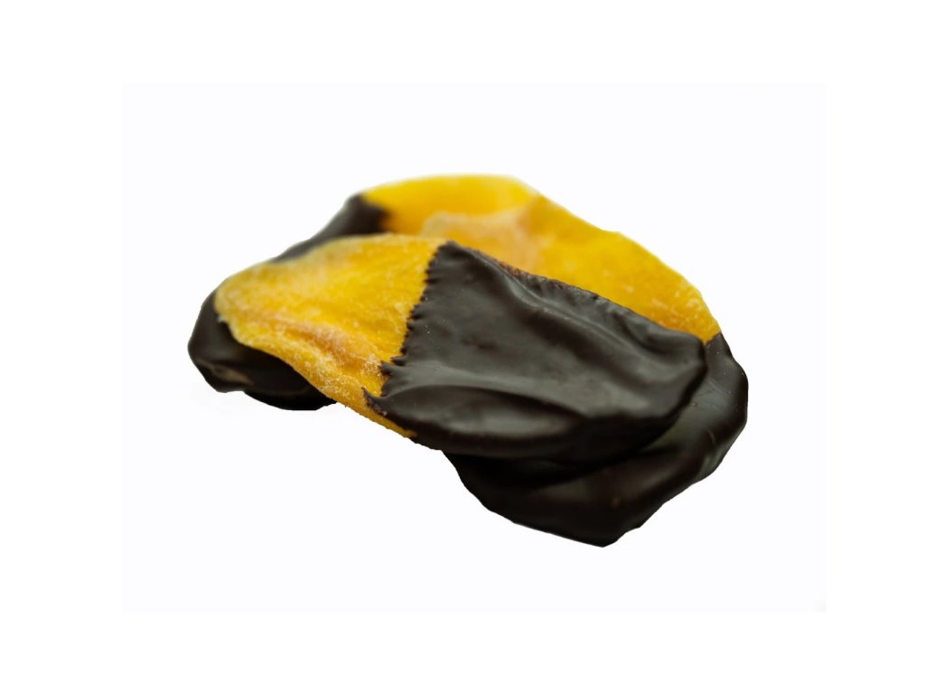 Plátky sušeného manga máčené v hořké 54,6% čokoládě.
