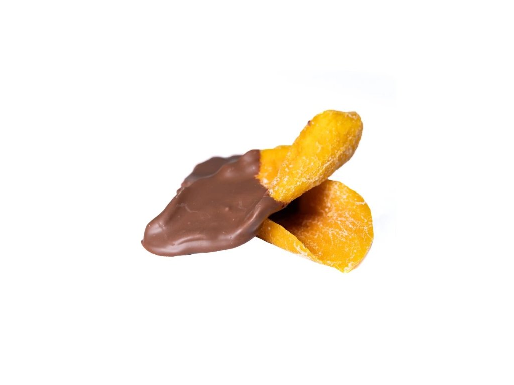 Plátky sušeného manga máčené v jemné mléčné čokoládě.