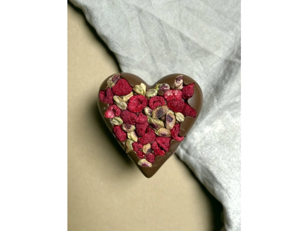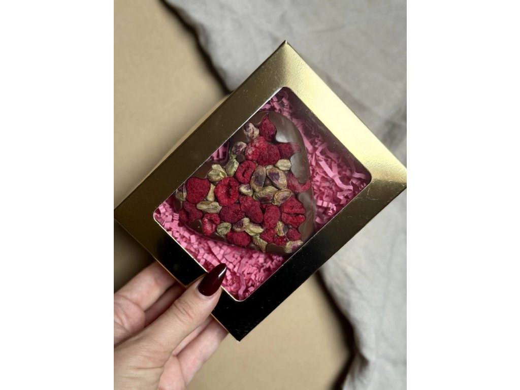 MAXI pralinka - Mléčná čokoláda s malinami a pistáciemi